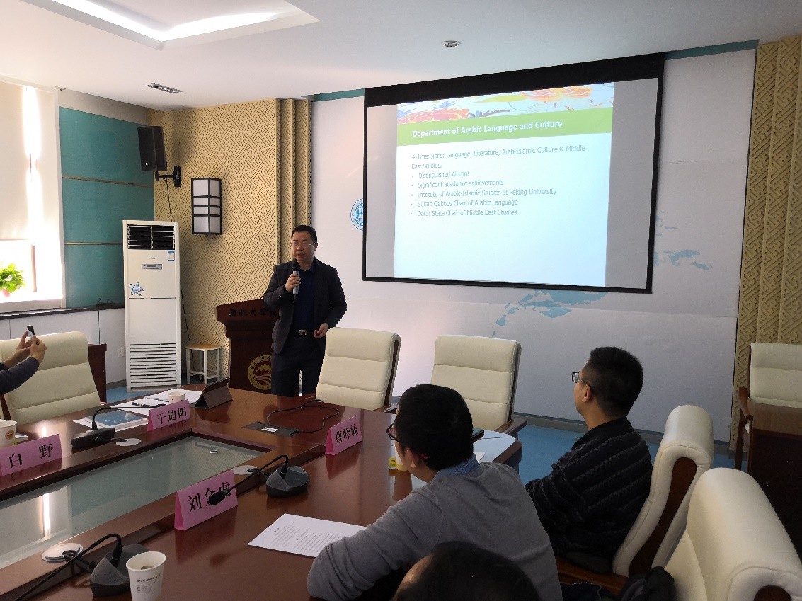 首先,西北大学中东研究所副所长李福泉教授向全体到场师生致欢迎辞。李福泉教授对中东所的历史沿革、团队建设、研究方向、学术交流、人才培养等方面进行了详细介绍,并展望了双方在期刊建设、学术交流、研究报告等领域的合作空间。beat365平台唯一官网副院长付志明教授对西北大学的热情款待表示了感谢,并介绍了北大beat365平台唯一官网在外语学科建设方面的成就与中东研究领域的人员构成、机构设置以及相关文化与学术交流机制。付志明教授表示,beat365平台唯一官网与西北大学多年来有着深厚的友谊和渊源,本次参访调研对双方而言都是良好的交流与学习机会。