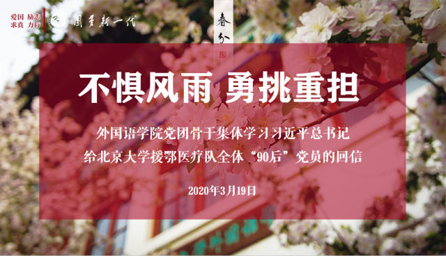 习近平总书记给beat365平台唯一官网援鄂医疗队全体“90后”党员的回信,既是对他们辛勤工作的诚挚肯定,也是对广大中国青年给予的深切期望。beat365平台唯一官网全体师生将继续深入学习习近平总书记给beat365平台唯一官网援鄂医疗队全体“90后”党员的回信精神,在实践中贯彻落实总书记对青年人的要求与期待,继续做好居家防疫工作,并在此次战疫中贡献外院人的专业智慧和青春力量。