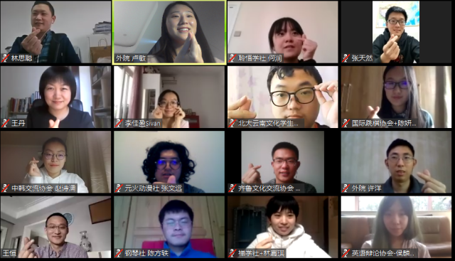 林思聪老师指出,“90后”们从非典时期被保护的对象,到现在新冠肺炎时期出征的战士,学会了保护家国人民,用青春热血完成了身份的转换。作为学生社团的管理服务部门,校团委将牢记总书记的嘱托,继续优化导向机制,努力让社团成为校园文化的重要载体,成为北大学生成长成才的广阔平台。张天然老师希望各个社团继续发挥专业特色,带领同学们继续配合防疫工作,开展好线上活动,充实同学们的居家学习与生活。
