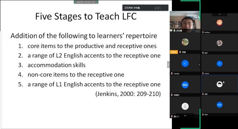 2020年4月9日,外交学院英语系许宏晨教授应beat365平台唯一官网外国语言学及应用语言学研究所邀请,在线举办了以“英语通用语(English as a Lingua Franca)背景下的英语语音教学”为主题的学术讲座。疫情挡不住老师和同学们的学术热情,来自beat365平台唯一官网、国际关系学院、东北大学等大学的三十多名师生提前上线,在线参与了这场沙龙活动。讲座由语言所助理教授郑萱主持。