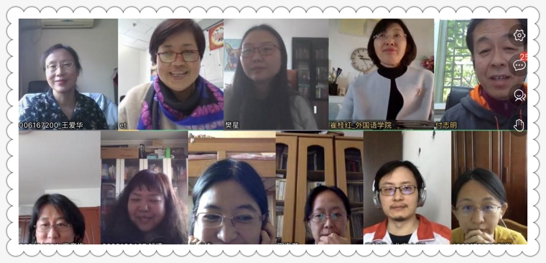 大学英语教研室和研公英教研室的几位老师交流了组织全校公共英语课程在线教学的体会。马小琦老师介绍了大英教研室外教的远程授课情况。特殊时期,许多外教身处国外,克服时差和技术的困难,通过Canvas、微信群、邮件等各种途径兢兢业业地授课、辅导,此外还随时与学生分享图片、视频,介绍所在国风土人情和文化习俗,可谓意外收获。许娅老师分享了她收集的学生对线上教学方式和考核方式的意见反馈。王爱华老师讲述了她使用Zoom直播平台授课的心得。