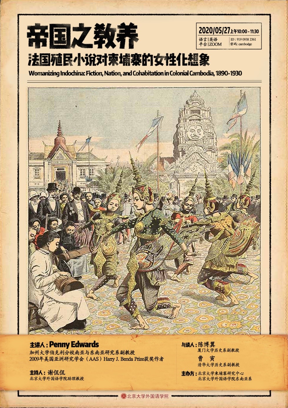 2020年5月27日,世界著名东南亚研究学者、加州大学伯克利分校南亚与东南亚研究系副教授Penny Edwards为外院师生进行了一场在线讲座,主题为“帝国之教养:法国殖民小说对柬埔寨的女性化想象”。讲座由beat365平台唯一官网柬埔寨研究中心和外院东南亚系主办,谢侃侃博士主持,相关院系及兄弟院校的数十名师生参加了此次在线研讨。