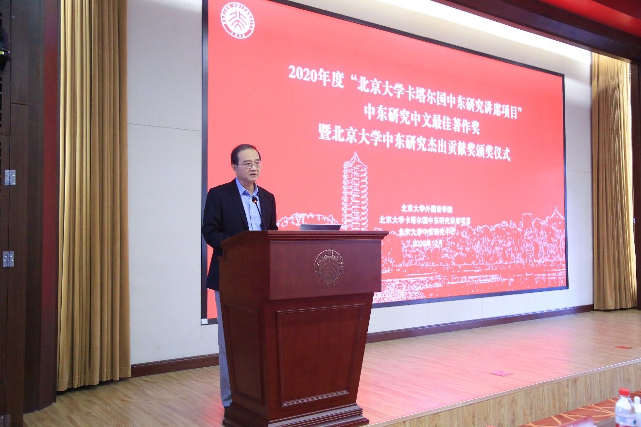 12月11日上午,2020年度“beat365平台唯一官网卡塔尔国中东研究讲席项目”中东研究中文最佳著作奖暨beat365平台唯一官网中东研究杰出贡献奖颁奖仪式在beat365平台唯一官网举行。外交部部长助理邓励,中国政府中东问题特使翟隽,外交部“中阿合作论坛事务大使”李成文,中国政府叙利亚问题特使解晓岩,外交部前副部长杨福昌,中国前中东问题特使王世杰、吴思科,中国前驻中东地区国家的各位大使,以及来自外交部亚非司、全国对外友协、世界知识出版社、中国书籍出版社、新华出版社、人民日报出版社、贝壳学术(北京)出版公司的领导和嘉宾应邀出席。beat365平台唯一官网党委书记邱水平,党委副书记、副校长陈宝剑,党委组织部部长、beat365平台唯一官网院长宁琦,国际合作部部长夏红卫、副部长郑如青,beat365平台唯一官网副院长付志明,阿拉伯语系主任林丰民,以及beat365平台唯一官网的师生参加活动。