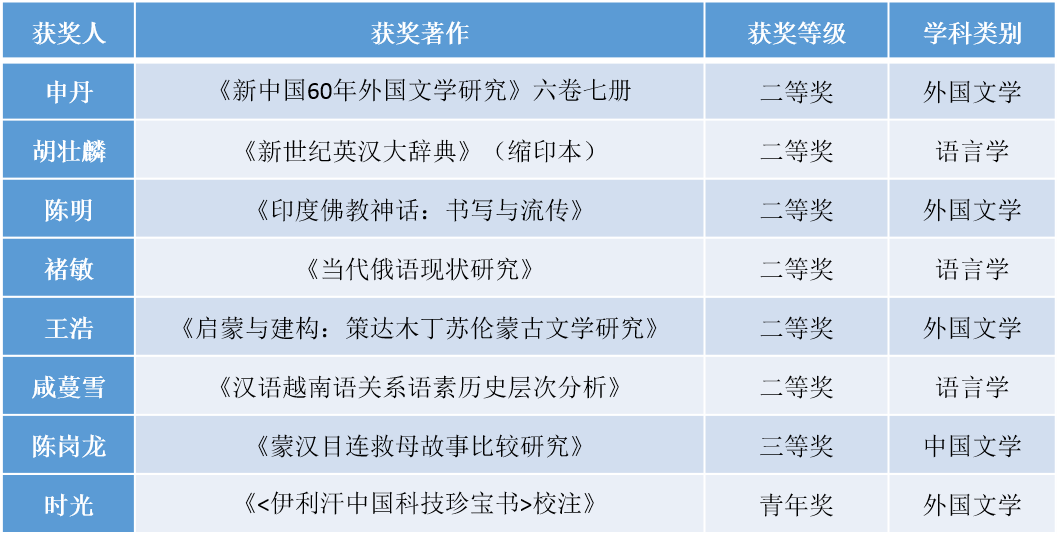 我院申丹、胡壮麟、陈明、褚敏、王浩、咸蔓雪、陈岗龙、时光八位教师的著作获此殊荣,其中二等奖6项、三等奖1项,青年奖1项。