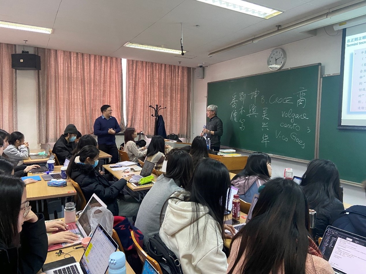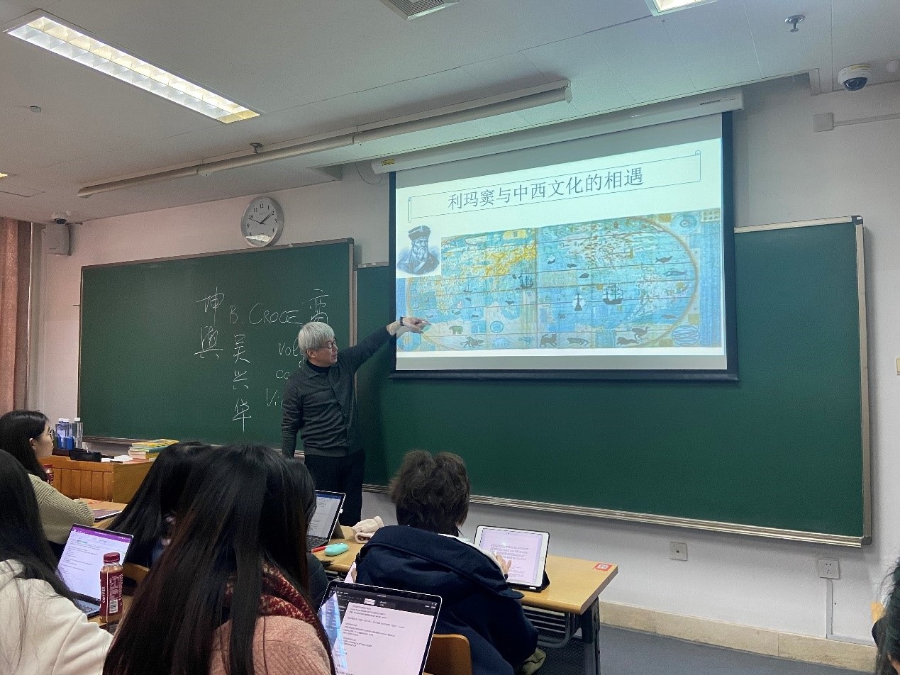 接着文老师举了马可波罗、利玛窦、郎世宁这三个意大利人的例子,他们分别于中国元、明、清朝抵达中国,以商人、学者/传教士、艺术家等不同身份,在中外文化交流的历史中占据了重要的地位。通过这些例子,他引导学生思考为什么中西方文明碰撞与交流的形象代言人总是来自亚平宁半岛?通过对马可波罗是否抵达中国之辩论,利玛窦规矩与礼仪之争,以及王小波与卡尔维诺在中国传播的关系等问题的具体分析,文老师与学生共同探讨了在中意文化交流史上不同时间节点,文化交流所采取的不同模式以及对双方国家及文化所产生的深远影响。