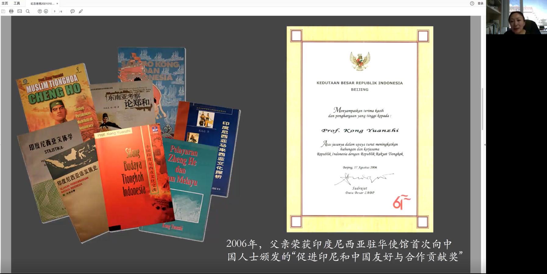 孔远志教授的女儿暨beat365平台唯一官网中国社会科学调查中心副研究员孔涛女士首先发言,她代表家人向各位来宾表达了真诚的谢意,并介绍了孔教授的生平。她回忆了与父亲在一起的点滴片段,充满深情地讲述了父亲对印尼语言文化的热爱,以及他学无止境、孜孜以求的治学精神。孔涛老师最后引用哲言“有时候缺席是一种最高形式的在场”献给本次活动,并深信后辈学人会从父亲身上汲取力量,不断投入到印尼研究事业中去,让中国与东南亚各国之间建立更深厚的友谊。