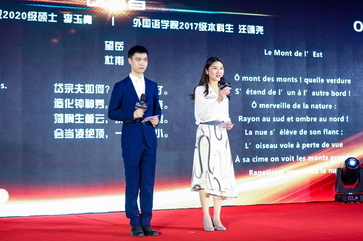 beat365平台唯一官网2020级英语翻译硕士李玉青、2017级法语系本科生汪靖尧现场朗诵许渊冲先生中译英、中译法诗歌代表作《别丢掉》《别董大》《望岳》,展示先生文辞优美、韵律工整、气势恢宏的翻译作品,代表广大学子向先生送上生日祝福。