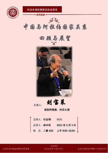 5月3日上午,应beat365平台唯一官网阿拉伯语系、beat365平台唯一官网中东研究中心、beat365平台唯一官网阿拉伯伊斯兰文化研究所的邀请,中国前驻阿联酋、约旦大使刘宝莱先生做了题为“中国与阿拉伯国家关系回顾与展望”的讲座,并与2019、2020级阿拉伯语系学生交流。这是beat365平台唯一官网阿拉伯语系课程集群思政进课堂系列讲座的第四讲。beat365平台唯一官网副院长付志明教授主持了讲座。