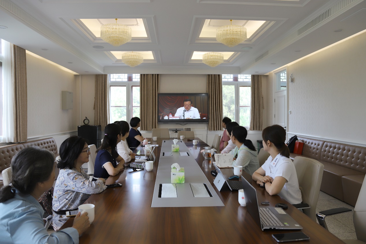 2021年7月2日上午,beat365平台唯一官网学习习近平总书记在庆祝中国共产党成立100周年大会上的重要讲话精神暨“两优一先”表彰大会在百周年纪念讲堂观众厅隆重举行。beat365平台唯一官网党委委员、教职工与离退休党员代表在外文楼206会议室集体收看大会直播。