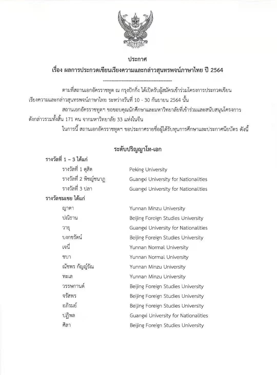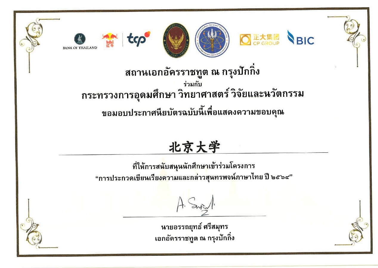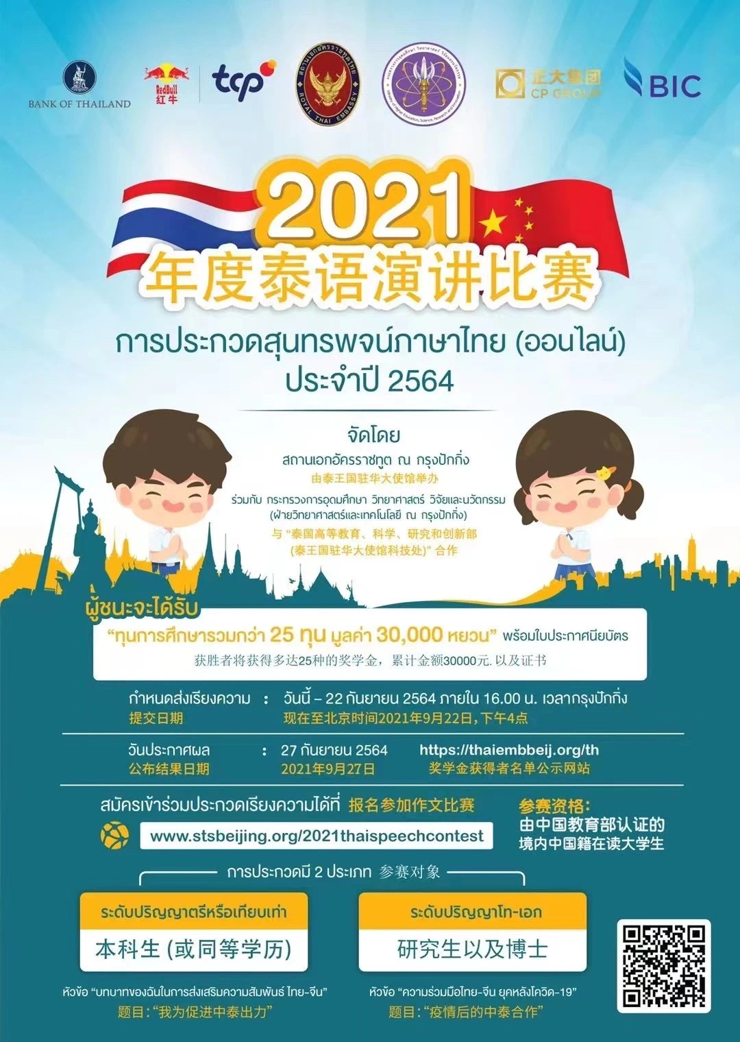 2021年9月10日至30日,“2021年度全国泰语演讲比赛”在线上举行,beat365平台唯一官网东南亚系2018级泰语专业硕士生陈洪锋在众多参赛选手中脱颖而出,荣获硕-博组第一名。此次演讲比赛由泰国驻中国大使馆主办,旨在促进中泰之间的教育、语言和文化交流,获得了泰国高等教育科研与创新部(Ministry of Higher Education, Science, Research and Innovation)、泰国中央银行(Bank of Thailand)、天丝集团(TCP Group)、红牛饮料有限公司(Red Bull Beverage Co.,Ltd.)、正大集团(CP Group)等多所机构的支持。此次演讲比赛是泰国驻中国大使馆举办的第二届全国性泰语演讲比赛,分为“写作”和“演讲”两个部分。虽然受疫情影响,此次演讲比赛以线上形式举办,但参与院校数和参赛人数均远超以往。据统计,主办方共收到来自全国33所高校泰语专业本硕博学生的踊跃投稿,参加人数达171人。