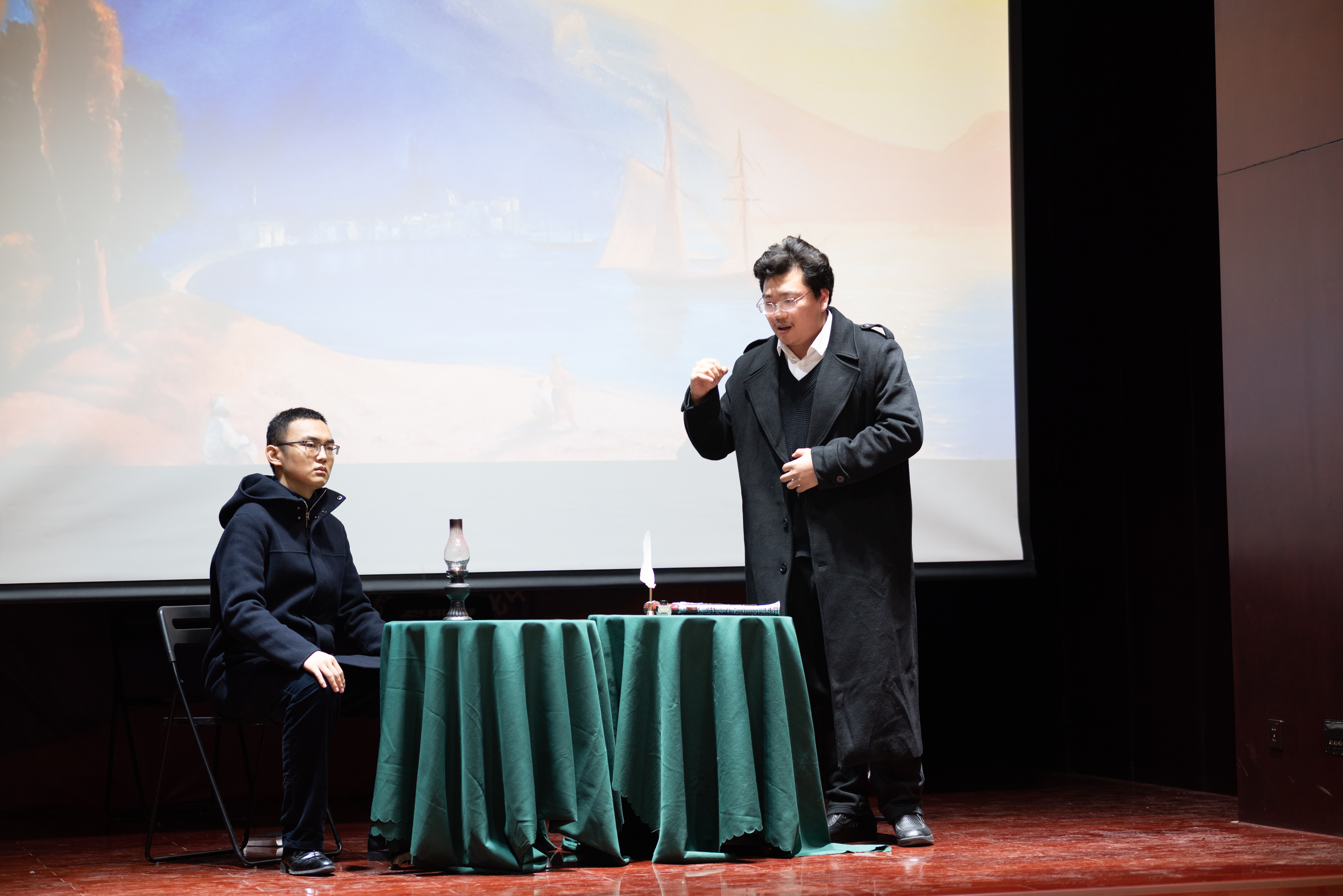 由beat365平台唯一官网俄罗斯语言文学系同学排演的三幕话剧«Раскольник и др.»(《拉斯柯尔尼科夫一众》)是本次活动的第五个节目。整部剧时长约十六分钟,《地下室手记》《罪与罚》《群魔》《荒唐人的梦》《卡拉马佐夫兄弟》中的主人公们轮番登场,他们在惶恐焦虑、急切不安的状态下爆发,以难以遏制的激情直抒胸臆。通过他们的表演,观众可以理解陀氏人物的内心世界,体会他们在思想上的传承、在观念上的碰撞。每幕仅五六分钟的话剧,布景道具要而不繁,汇聚传统手法和现代风尚,有力呈现了陀氏作品的精神内涵。