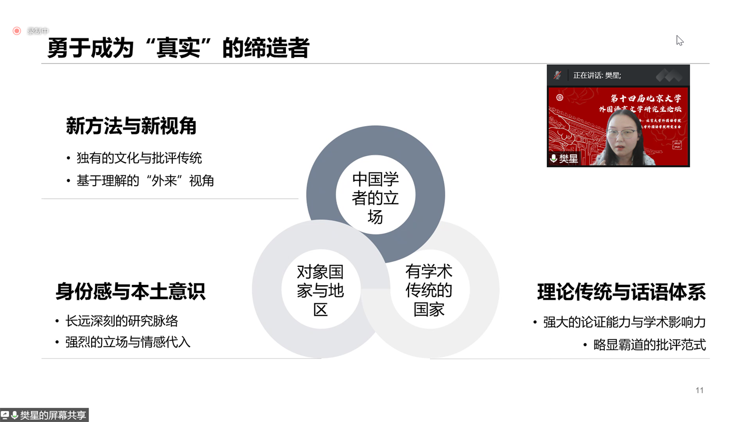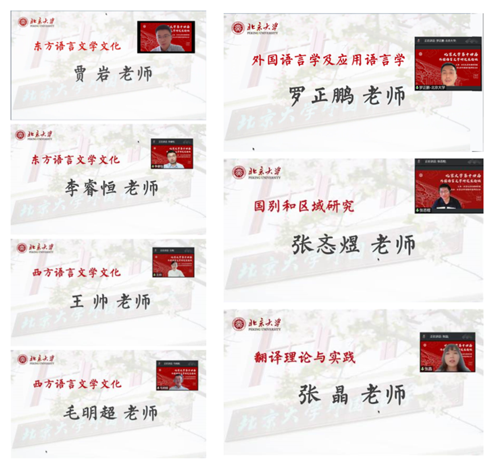 上午的开幕式和主会场报告结束后,参会同学分别进入十六个分论坛会场,以线上的形式进行发言和讨论。分论坛一共分为东方语言文学文化、西方语言文学文化、外国语言学及应用语言学、翻译理论与实践、国别与区域研究五大方向,其中东方语言文学文化方向共设四个分会场、西方语言文学文化方向共设六个分会场,语言学、翻译学和国别区域研究方向各设两个分会场。今年论坛将研究背景和专业语种有共通之处的参会者置于同一组别,同学们在分享研究成果的同时,也认真倾听了其他同学的报告,并对产生的疑问和感兴趣的内容进行讨论和阐发,虽然相聚在云端,但线上会议室里气氛依旧活泼热烈。俄语系王帅老师、德语系毛明超老师、国别与区域研究专业张忞煜老师、南亚学系贾岩老师、外国语言学及应用语言学研究所罗正鹏老师、日语系张晶老师及阿拉伯语系李睿恒老师担任分论坛点评嘉宾,各位老师就部分同学的发言进行了点评,在肯定同学们研究价值的同时提出了宝贵的建议。