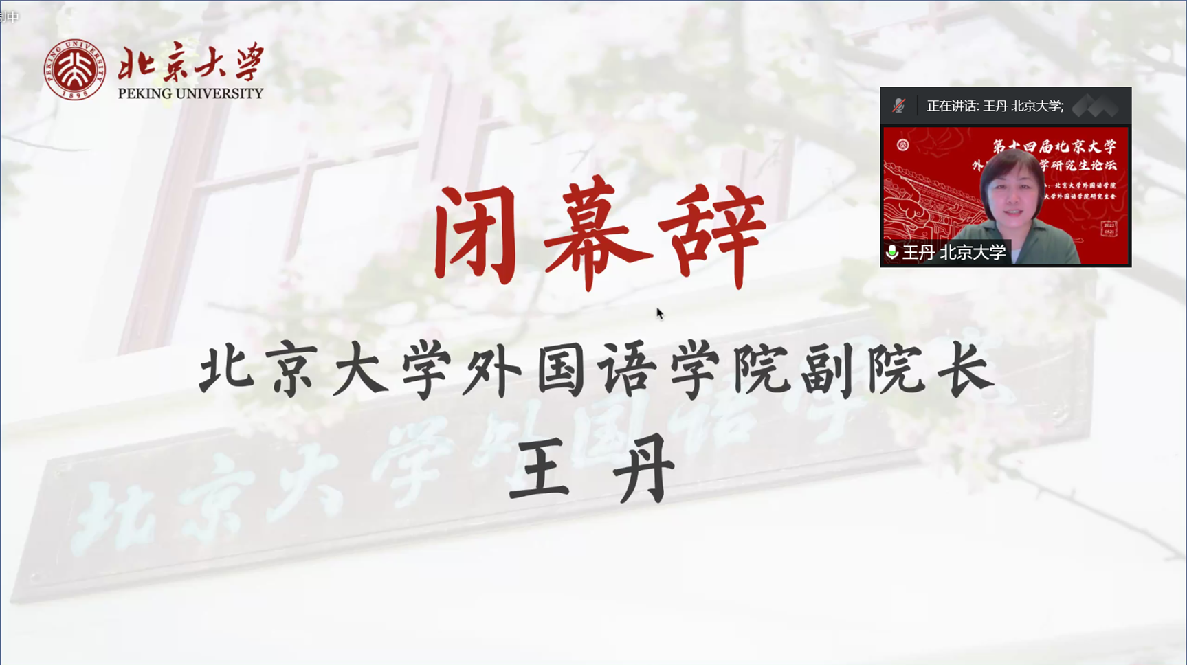 在论坛的尾声,王丹副院长向大家致闭幕辞。王丹老师回顾了本次论坛半年来的筹办历程,对各位同学在论坛上所取得的学术成果致以祝贺,向参与论坛的同学、114名论文评审老师、开幕式主旨发言的两位老师和参与分论坛点评的7位老师、为论坛保驾护航的学工办老师、参与论坛筹备的外院研究生会同学及20余位论坛志愿者表达了诚挚的谢意,希望平等且富有成效的交流能够为同学们今后的学术成长注入新的动力。最后,宣布本届论坛圆满闭幕。