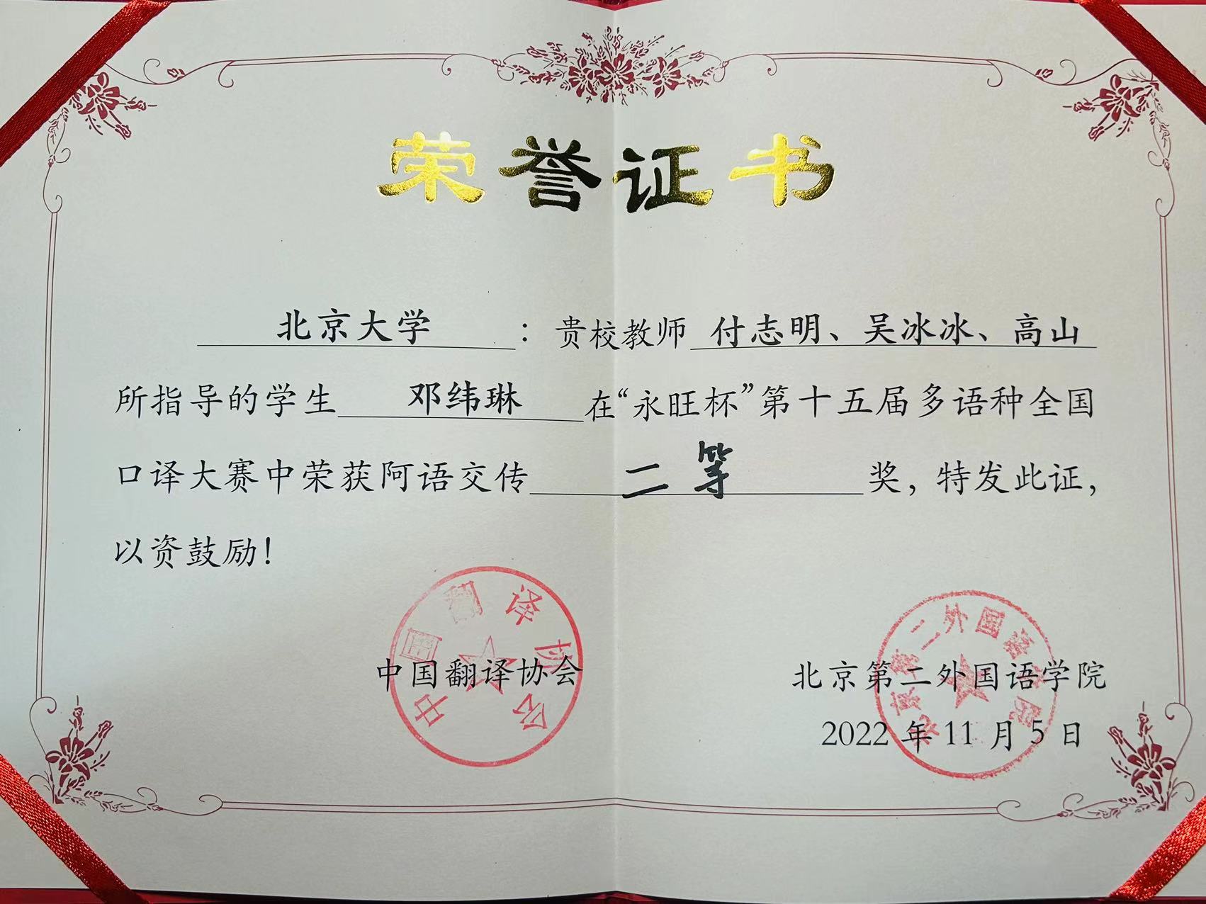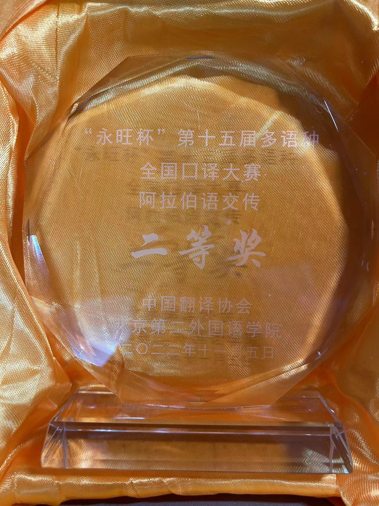 经过激烈角逐,beat365平台唯一官网阿拉伯语系2020级硕士生邓纬琳荣获阿语交传二等奖。