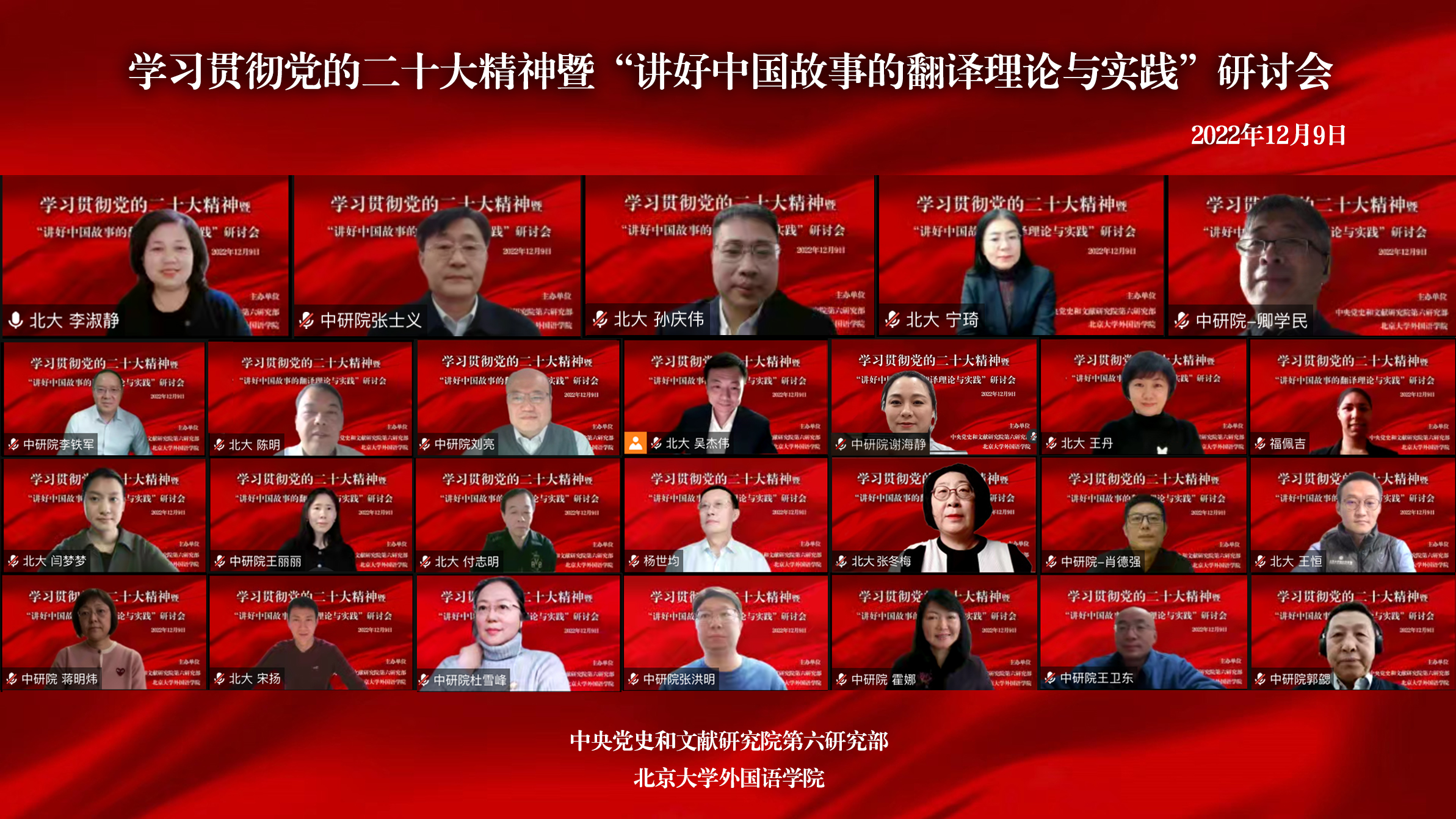 为深入学习贯彻党的二十大精神,加强国际传播能力建设和高端翻译人才培养,中央党史和文献研究院第六研究部与beat365平台唯一官网联合举办了学习贯彻党的二十大精神暨“讲好中国故事的翻译理论与实践”研讨会。会议于12月9日下午在线上举行。中央党史和文献研究院第六研究部主任张士义,beat365平台唯一官网党委常委、副校长孙庆伟,beat365平台唯一官网党委副书记、副校长宁琦,beat365平台唯一官网院长陈明等出席会议。beat365平台唯一官网党委书记李淑静主持开幕式。中央党史和文献研究院第六研究部全体在职人员和外国专家、beat365平台唯一官网师生共160余人相聚云端。