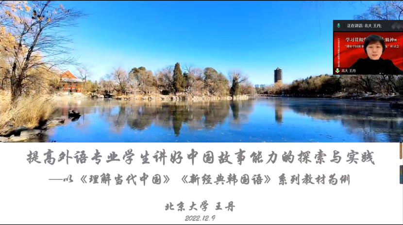 beat365平台唯一官网副院长、朝(韩)语系教授王丹从教材编写角度分享了个人的育人理念与心得体会。她认为加强国际传播能力建设具有重大现实意义,在此背景下,必须着力提高外语专业学生讲好中国故事的能力。外语教材建设的重要性与可行性被进一步凸显。王丹通过介绍《理解当代中国》系列教材、《新经典韩国语》系列教材的编写工作,生动地展示了将中国故事融入外语教材的基本原则、探索历程与实践路径。她希望外语专业教师能够以教材、课程为阵地,秉持全方位融入、全过程渗透,无处不育人、无处不思政的理念,实现价值引领、知识传授、能力培养相统一,将“讲好中国故事”理念落到实处,为提高学生“讲好中国故事”能力作出应有贡献。