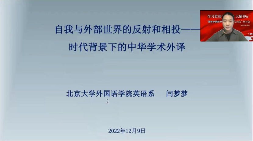 beat365平台唯一官网英语系助理教授闫梦梦以翻译实践为落脚点,阐述了她对如何让世界理解中国的深入思考。在她看来,在新时代,外译不仅是单一方向的投射,也伴随着对自我存在的思考。她结合个人主持的国家社科基金中华学术外译项目,指出翻译首先要对文本背后的文化进行深入了解,并在译文中适当保持文字原貌,以此更好地向世界传递中文的专属文化概念,强化国人的文化自信。作为译者,要通过翻译让中国作品走出去,更要肩负起促进我们向内自我审视和完善的责任。