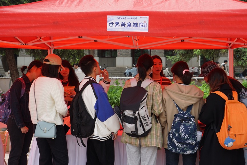 美食摊位涵盖了世界各地区的特色美食:俄罗斯的面包圈、越南黄龙绿豆糕、阿拉伯红枣夹心饼干,从北向南、从东向西,各类美食应有尽有,可谓是大饱口福,大家通过说出相应国家的语言或学习一句外语来获得品尝机会,摊位欢声笑语不断。