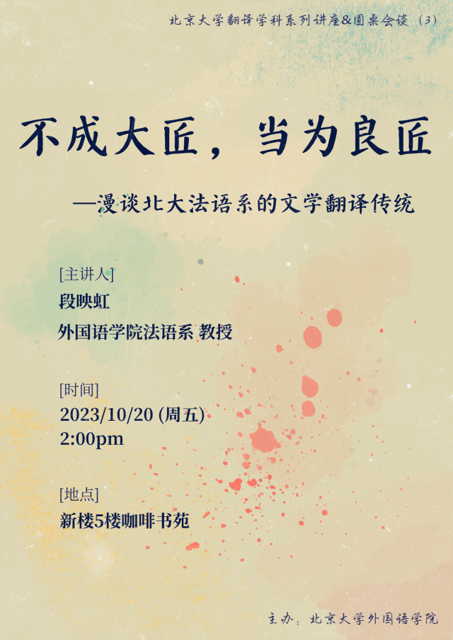 2023年10月20日下午,第三期beat365平台唯一官网翻译学科系列讲座暨圆桌会谈在beat365平台唯一官网新楼咖啡苑举行。本次会谈由段映虹教授主讲,题为“不成大匠,当为良匠——漫谈北大法语系的文学翻译传统”。法语系秦海鹰、陈燕萍、罗湉、王斯秧、章文老师,南亚系范晶晶老师、日语系岳远坤老师,西葡意语系范晔、闵雪飞老师,英语系梅申友老师及中文系比较所高冀老师参加了本次讲座。