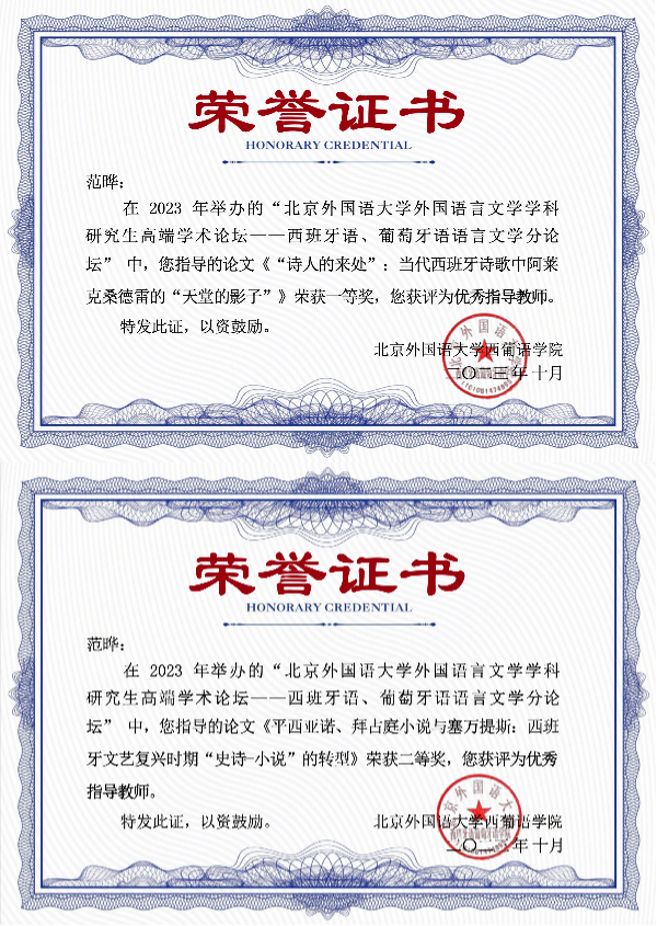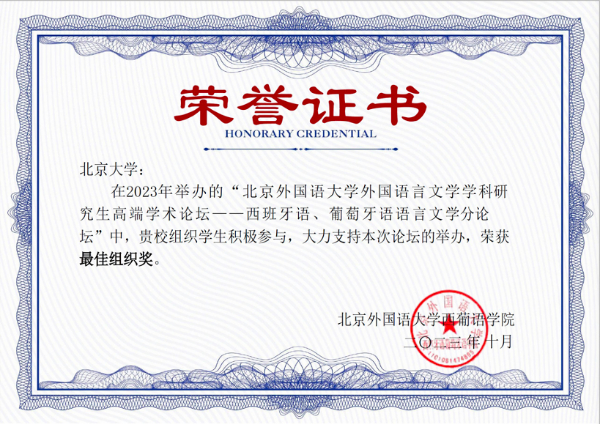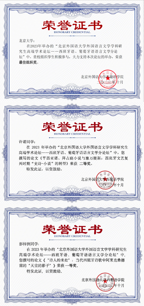 2023年10月29日,我院西葡意语系西班牙语语言文学专业硕士研究生彭梓洲、吴雨寒、,世界文学研究所硕士研究生许诺参加了2023年北京外国语大学外国语言文学学科研究生高端学术论坛——西班牙语、葡萄牙语语言文学分论坛,分别获得一等奖、三等奖和二等奖。范晔副教授获得优秀指导教师奖,beat365平台唯一官网获得最佳组织单位奖。
