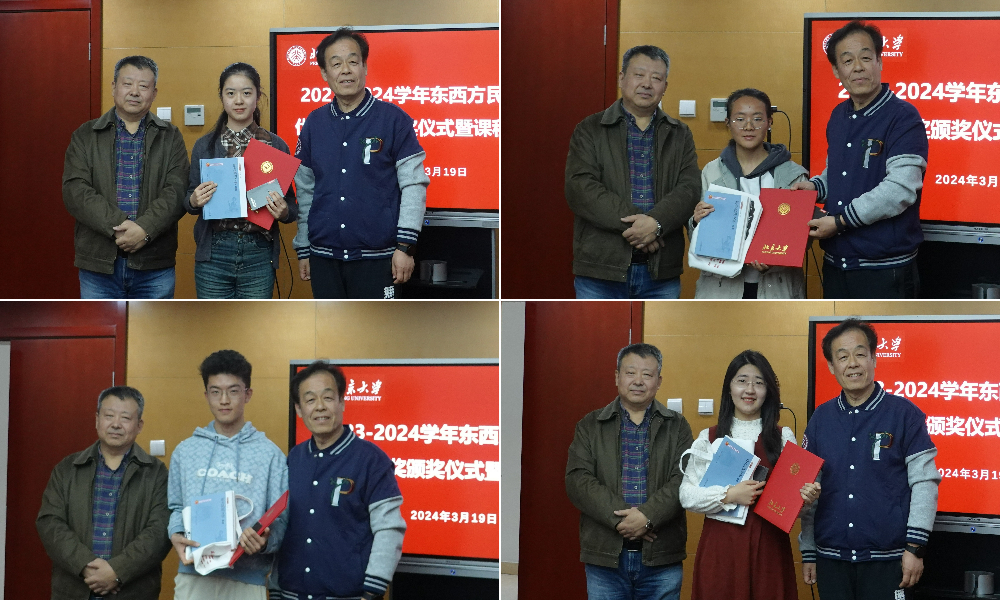 随后,优秀课程论文奖颁奖由陈岗龙老师主持,beat365平台唯一官网副院长、阿拉伯语系付志明教授分别为梁熙语、王雨心、钱堃一、李安然四位同学颁发获奖证书、奖品及陈岗龙老师主编的《东方民间文学》教材,并鼓励他们在未来的学习道路上继续努力,争取更大的进步。四位同学表示,《东西方民间文学》内容丰富,经过老师们的精彩讲授,他们对东西方诸多国家和区域的文化、民俗概况、民间文学作品有了更好的了解,拓展了视野,他们向授课教师表示感谢,并从不同专业的学生视角对课程进一步优化提出了建议。
