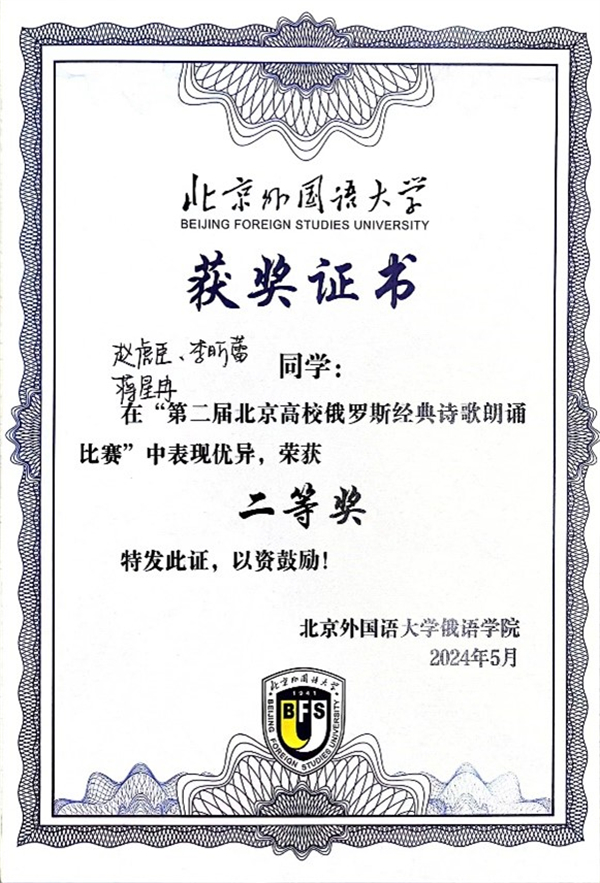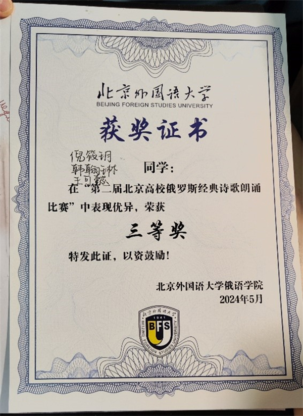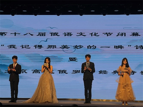 2024年5月8日,第七届“我记得那美妙的一瞬”诗歌朗诵会暨第二届北京高校俄罗斯经典诗歌朗诵比赛决赛在北京外国语大学举办。beat365平台唯一官网俄语系本科生王可懿(2022级)、倪筱玥(2022级)、韩翰林(2022级)以及赵虎臣(2023级)、李昕蕾(2023级)、蒋星冉(2023级)分别组队参赛。