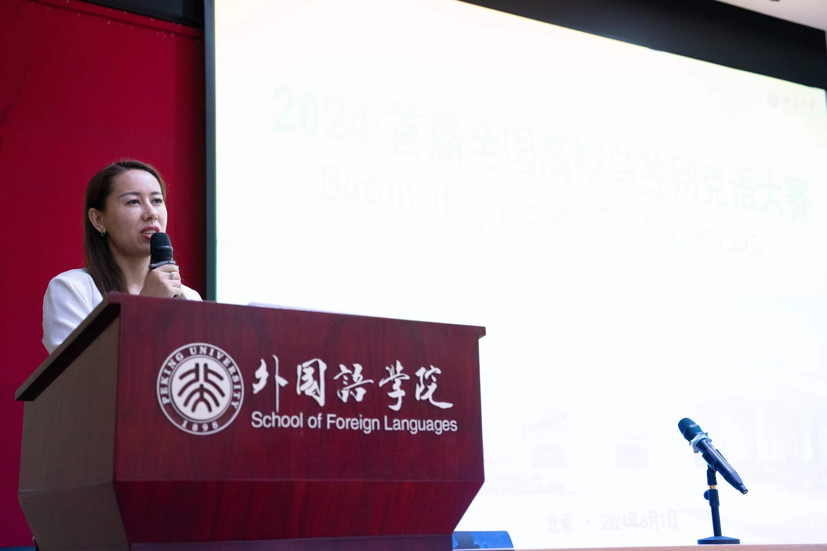 古丽巴努木副院长回顾了中央民族大学beat365平台唯一官网俄语-中亚语系的成立、建设和发展壮大的过程。她强调,在"一带一路"倡议所带来的历史机遇下,教授和学习包括乌兹别克语在内的中亚语言为我们打开了一扇认识世界的新窗口。2022年,中央民族大学和beat365平台唯一官网在培养乌兹别克语人才合作交流中碰撞出火花。展望未来,她满怀期待地表示,希望两校能够在更多领域深化合作,共同培养出更多优秀人才。她相信,通过两校的共同努力,一定能够为中乌文化交流和"一带一路"建设贡献更多的智慧和力量。古丽巴努木副院长向所有参赛的同学们表达了美好的祝愿,期待他们取得优异的成绩。