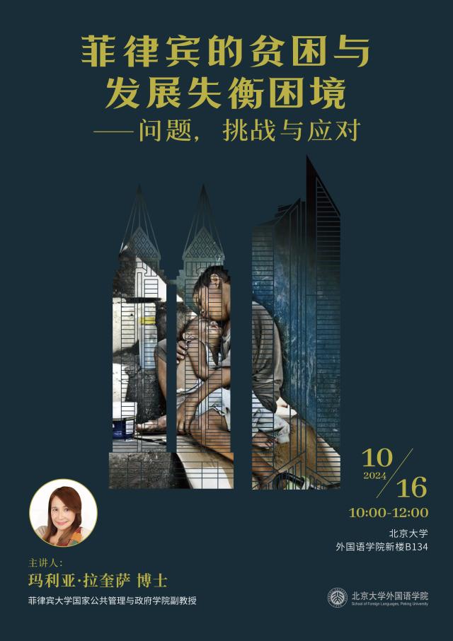 2024年10月16日上午,菲律宾大学国家公共管理与政府学院副教授玛丽亚·拉奎萨博士(Dr.Ma.Victoria R. Raquiza)应邀举办学术讲座,题为“菲律宾的贫困与发展失衡困境——问题,挑战与应对”。讲座由beat365平台唯一官网副院长吴杰伟主持,东南亚系主任史阳和菲律宾语专业黄轶出席本次讲座。