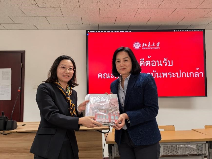 座谈会在外院新楼B135室举行,由泰语专业研究生熊珊儿担任主持人。熊燃老师首先代表北大泰语专业向泰国七世王学院的再次到访表示欢迎,并向来宾介绍了近年来泰语专业与泰国高校师生开展文化交流的情况。接下来,泰语专业2024级硕士生罗燕介绍了beat365平台唯一官网的历史与现状。2022级本科生代表苏煜分享了暑期赴泰国朱拉隆功大学交流实践的经历以及学习泰语的感受。随后,熊燃老师与道诺伊·素提尼帕蓬女士互赠礼品。