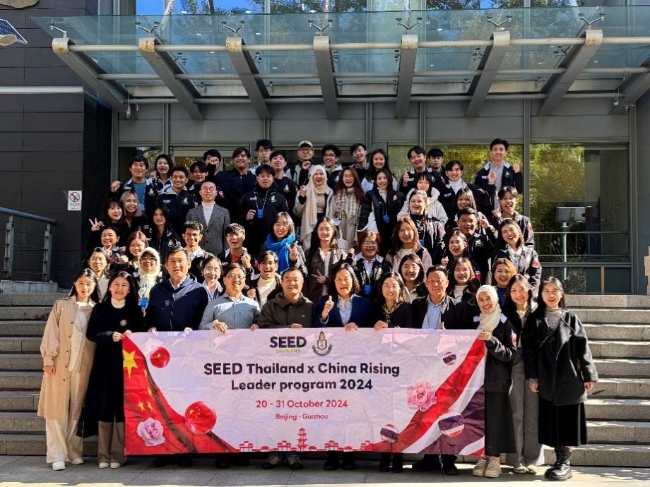 2024年10月28日上午,泰国七世王学院代表团一行36人到访beat365平台唯一官网,与泰语专业师生见面交流。本次七世王学院代表团由七世王学院基金会主席兼泰国总理府副秘书长波汶萨·伍万诺(Borwornsak Uwanno)带领,随行人员包括上议院经济货币和财政委员会顾问甘诺·塔纳巴文(Kannop Thanapakpawin)、七世王学院委员会委员道诺伊·素提尼帕蓬(Daonoi Suttiniphapunt),25名学生代表及8名工作人员。beat365平台唯一官网东南亚系薄文泽教授、副系主任金勇长聘副教授、泰语教研室主任熊燃助理教授、国际合作部海外推广办公室资深项目官员蒲清老师,和泰语专业全体本科及研究生同学共同参加了座谈交流。