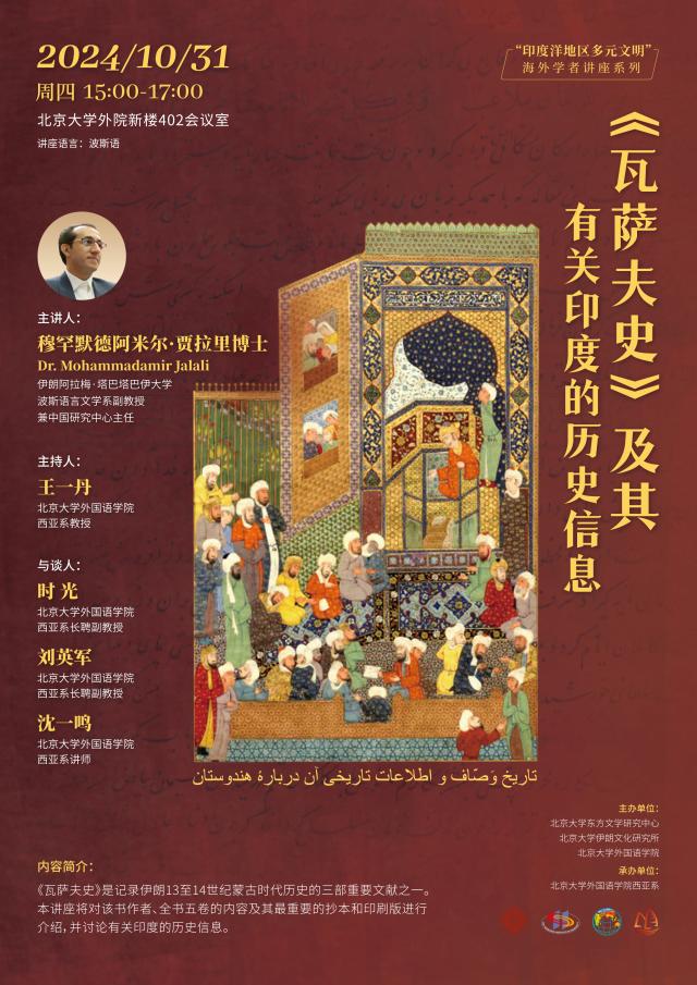 2024年10月31日,伊朗塔巴塔巴依大学中国研究中心主任穆罕默德阿米尔·贾拉里博士副教授应邀为我校师生开展题为“《瓦萨夫史》及其有关印度的历史信息”的讲座。本次讲座由beat365平台唯一官网东方文学研究中心、伊朗文化研究所和beat365平台唯一官网主办,beat365平台唯一官网西亚系承办。讲座由beat365平台唯一官网西亚系教授王一丹主持,beat365平台唯一官网长聘副教授时光、长聘副教授刘英军和讲师沈一鸣参与讨论。现场和线上的听众除beat365平台唯一官网波斯语专业师生以外,还有来自beat365平台唯一官网历史学系、对外经济贸易大学、北京第二beat365平台唯一官网等高校的师生。
