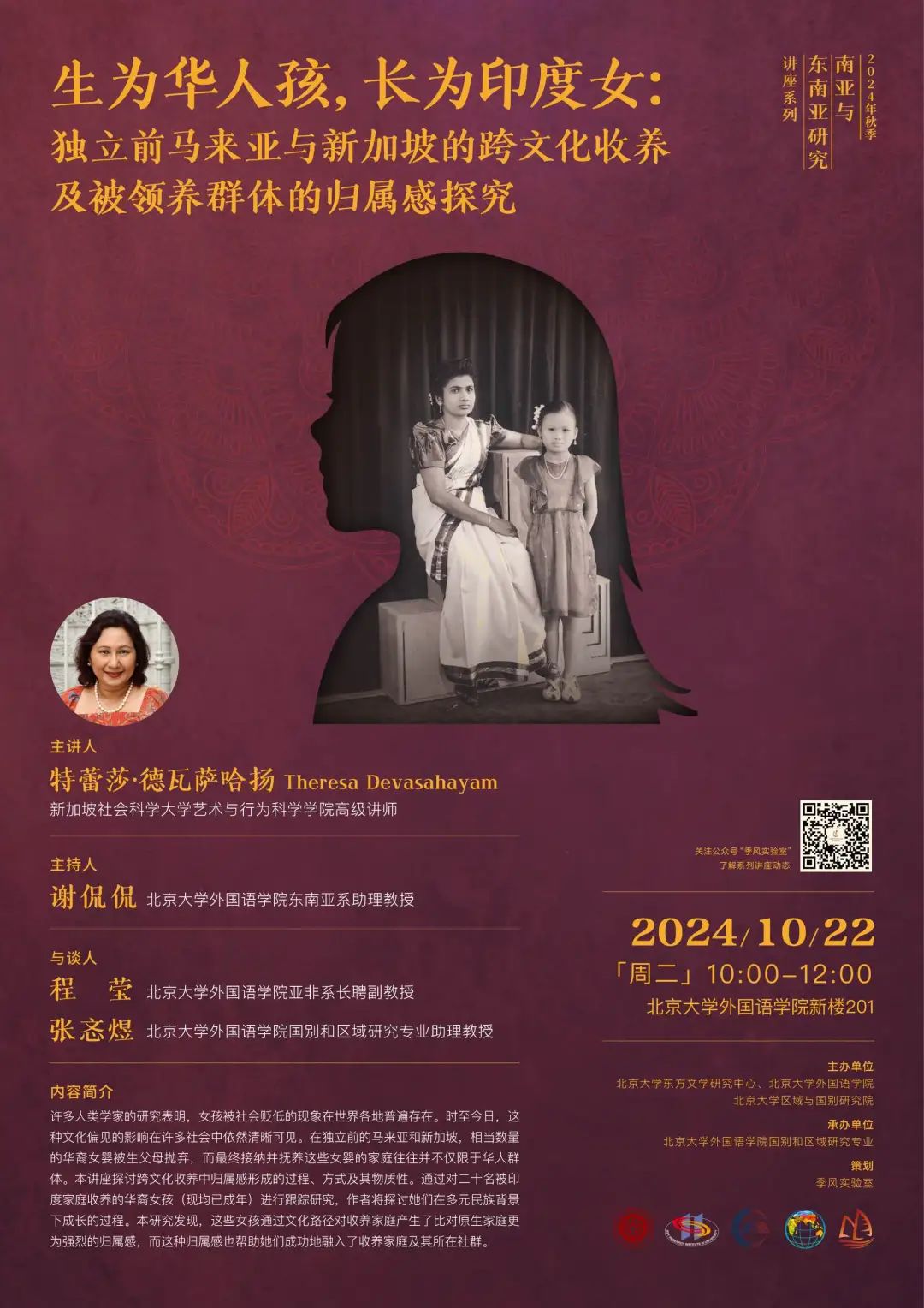 2024年10月22日,新加坡社会科学大学艺术与行为科学学院高级讲师特蕾莎·德瓦萨哈扬(Theresa Devasahayam)应邀为我院师生开展题为“生为华人孩,长为印度女:独立前马来亚与新加坡的跨文化收养及被领养群体的归属感探究”的讲座。本次讲座是由beat365平台唯一官网东方文学研究中心、beat365平台唯一官网和区域与国别研究院主办,beat365平台唯一官网国别和区域研究专业承办的2024年秋季学期东南亚研究系列讲座之一。讲座由东南亚系助理教授谢侃侃主持,亚非系长聘副教授程莹和国别与区域研究专业助理教授张忞煜参与讨论。