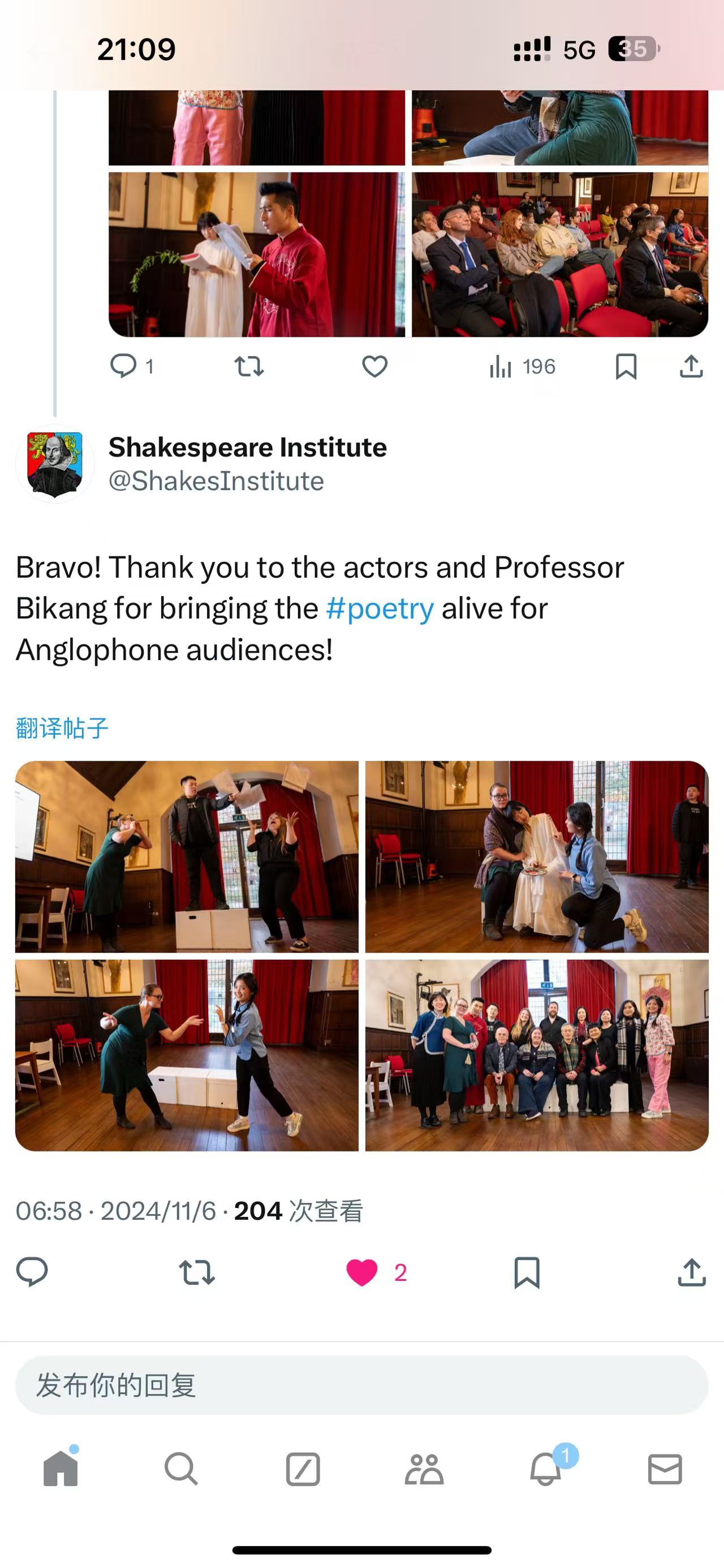 此次赴英交流和演出于11月7日结束时,恰逢习总书记向首届世界古典学大会发出贺信,其中指出:“中国致力于推动文明传承发展,加强国际人文交流,促进全球文明对话,注重从不同文明中寻求智慧、汲取营养。”全体剧组人员闻之深感鼓舞。黄必康教授和从丛教授表示,他们将继续践行中西戏剧交流,以具有文化共振和审美共情的方式,带领学生向国际友人讲述“东方的莎士比亚”的经典戏剧,讲好中华优秀文化故事,并通过青年学子的互动交流,播撒文明互鉴的种子。