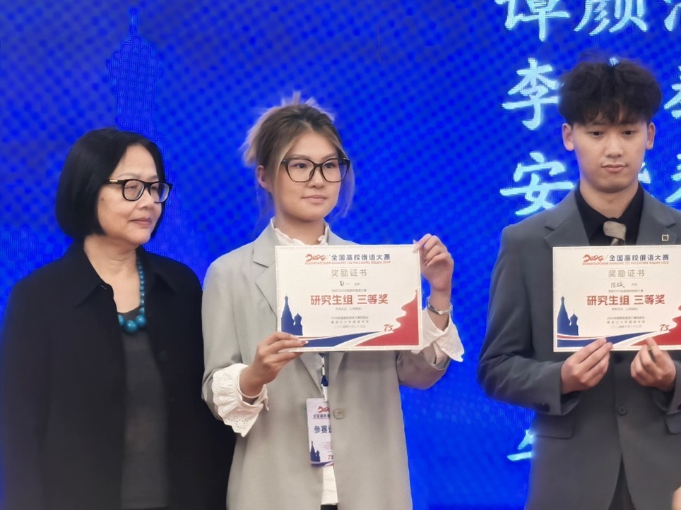 2024年10月26日至27日,第十七届全国高校俄语大赛的复赛与决赛在哈尔滨市伏尔加庄园举行。本次大赛由教育部国际合作与交流司主办,黑龙江大学承办。beat365平台唯一官网俄语系本科生马卓仪(2023级)、苏传顺(2021级)与硕士研究生郭一(2023级)参加此次 比赛。马卓仪获低年级组二等奖,苏传顺获高年级组三等奖,郭一获研究生组三等奖。