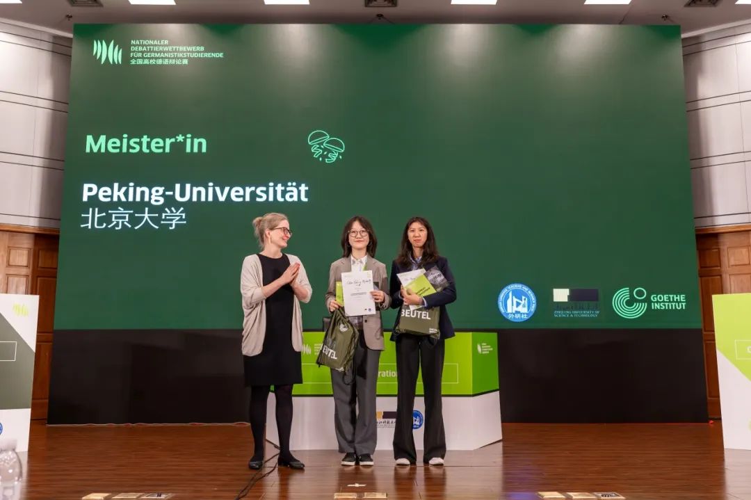 2024年11月9-16日,由北京德国文化中心·歌德学院(中国)、浙江科技大学及外语教学与研究出版社共同主办的第十四届全国高校德语系专业大学生德语辩论赛在浙江杭州圆满落幕。本项赛事历来是德语本科教学领域最为重要的赛事之一,历史悠久、备受瞩目。辩论采用双人组队、现场抽取对手、论题与正反方的规则,每场辩论前仅有10分钟的准备时间,因此对参赛选手的语言表达、逻辑思辨、临场应变等综合能力均是很大挑战。本届大赛汇聚全国44所高校的参赛队伍,采用线上预赛、线下决赛的方式举办,16支在预赛表现最为出色的队伍进入复赛阶段,而复赛则采用单败淘汰制,直至产生最后的冠军。beat365平台唯一官网德语系选派2021级本科生陈雨亭(一辩)与2023级本科生何海盈(二辩)搭档,经过多轮角逐,最终脱颖而出,荣膺全国冠军。