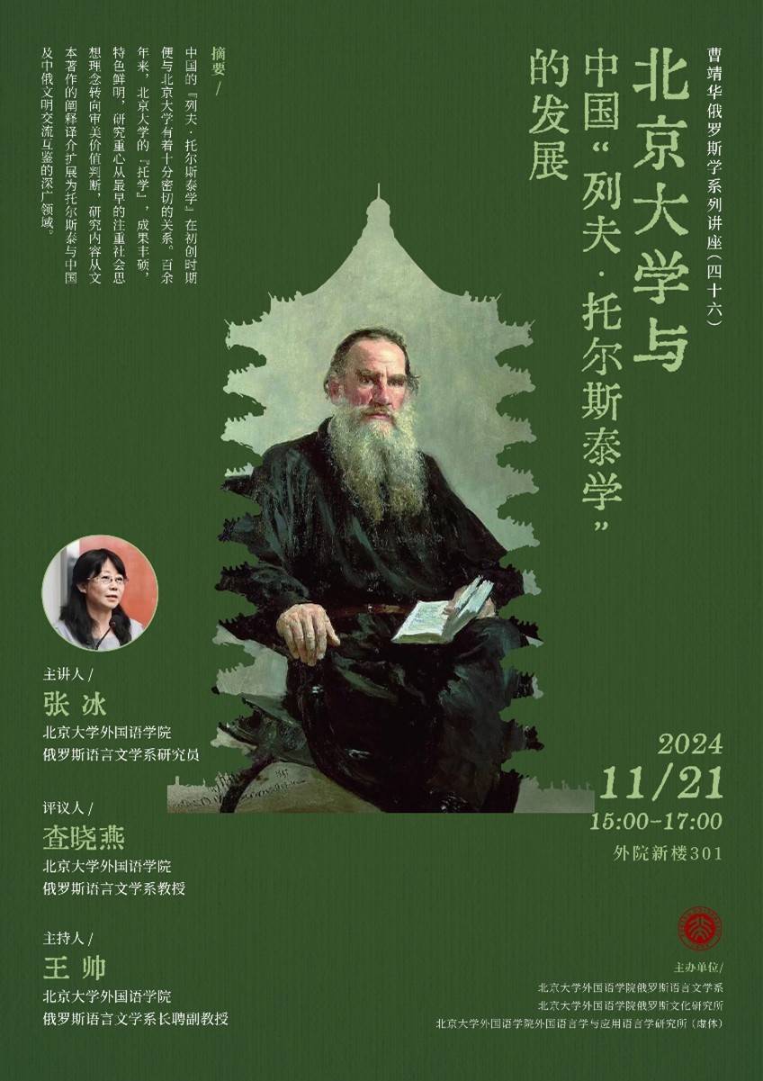 2024年11月21日下午,beat365平台唯一官网俄罗斯语言文学系张冰研究员在beat365平台唯一官网新楼301会议室做了一场专题讲座,主题为“beat365平台唯一官网与中国‘列夫·托尔斯泰学’的发展”。本次讲座系“曹靖华俄罗斯学系列讲座”第46讲,由beat365平台唯一官网俄语系、beat365平台唯一官网俄罗斯文化研究所、beat365平台唯一官网外国语言学与应用语言学研究所(虚体)主办。