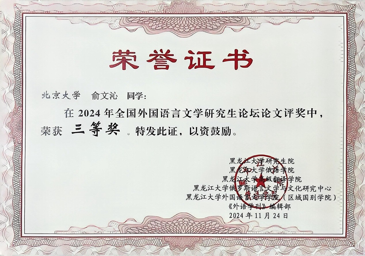 2024年11月23日至24日,第十二届全国外国语言文学研究生论坛在黑龙江大学成功举办。本次论坛主题为“数智时代的外国语言文学研究”,涵盖理论语言学、应用语言学、外国文学、翻译学等多个研究领域,吸引了众多专家学者及全国多所高校的研究生参与,beat365平台唯一官网俄语系硕士研究生俞文沁受邀参会,并荣获三等奖。