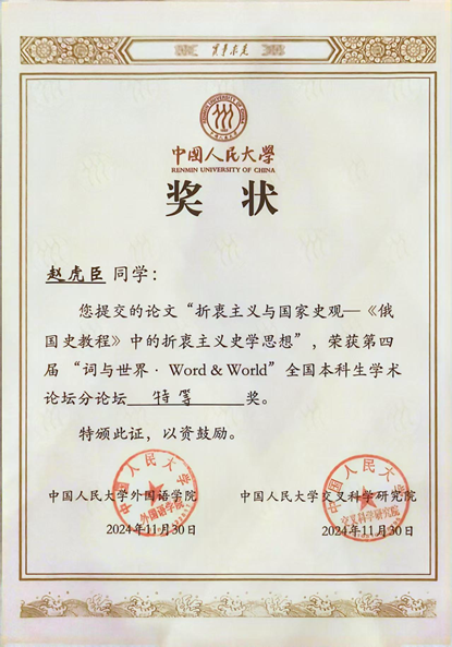喜报:俄语系本科生赵虎臣在第四届 “词与世界·Word & World”全国本科生学术论坛中获奖