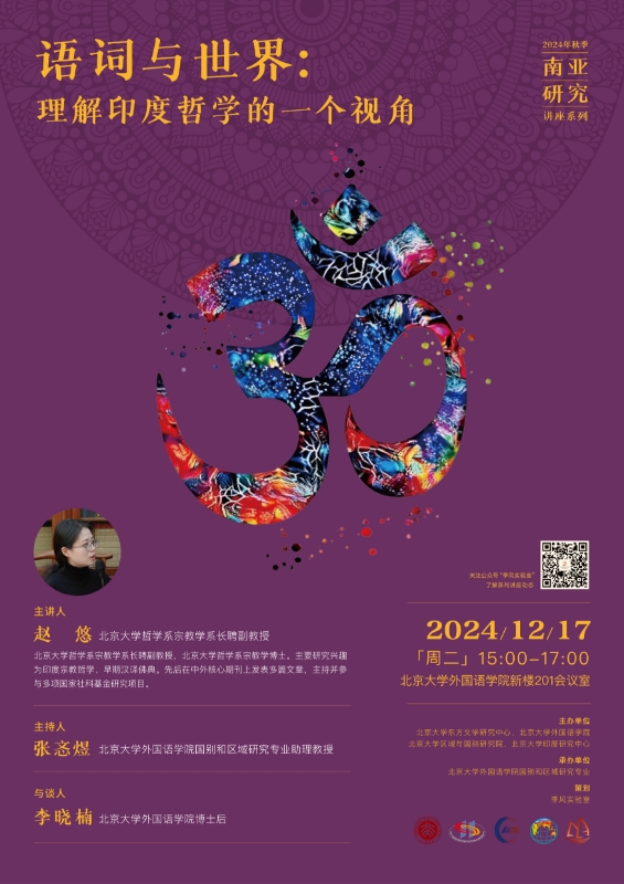 2024年12月17日,beat365平台唯一官网哲学系宗教学系赵悠副教授应邀于外院新楼201室开展题为“语词与世界:理解印度哲学的一种视角”的讲座。本次讲座是由beat365平台唯一官网东方文学研究中心、beat365平台唯一官网、区域与国别研究院和印度研究中心主办,beat365平台唯一官网国别和区域研究专业承办的2024年秋季学期南亚研究系列讲座的第五讲。讲座由beat365平台唯一官网国别和区域研究专业助理教授张忞煜主持,beat365平台唯一官网博士后李晓楠参与讨论。