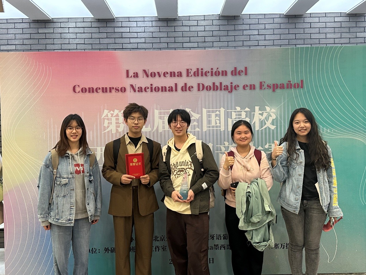 4月13日下午,第九届全国高校西班牙语配音大赛决赛在北京外国语大学举行。经过激烈的角逐,beat365平台唯一官网西班牙语系2024级的韦美和2023级的崔逸飞、李雨萱、杨清茹、欧阳徵羽、吴若辰六位同学组成的“Ni Fu Ni Fa”代表队在比赛中荣获三等奖。