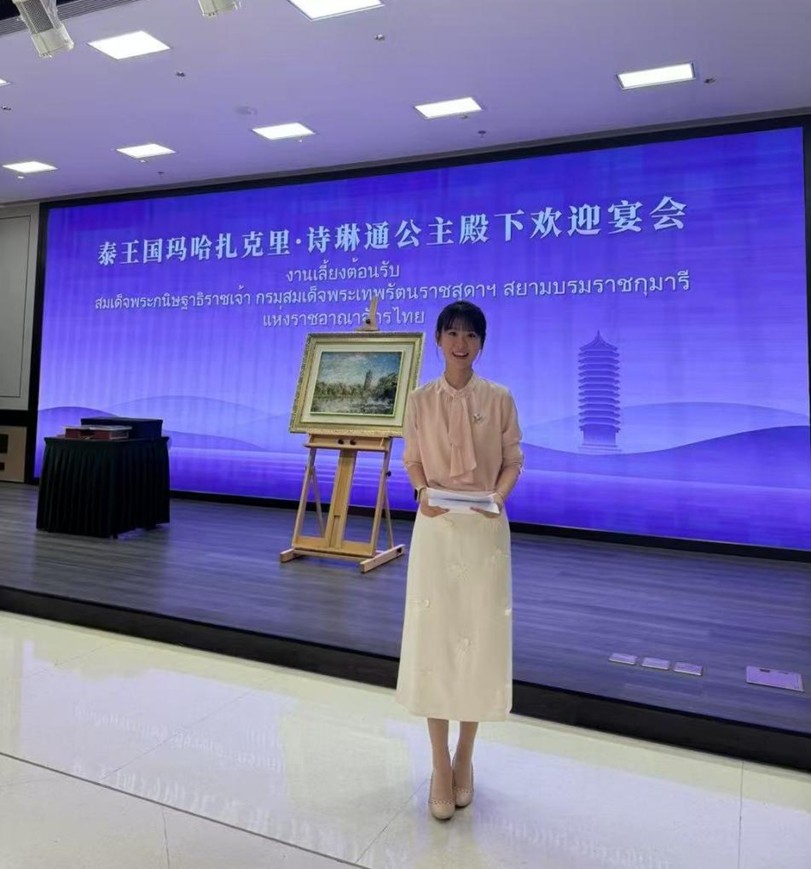 2024级硕士研究生熊珊儿担任了午宴校领导致辞的泰语翻译,以流畅的泰语语音和沉稳的临场表现出色完成任务。她说:“首次参与到诗琳通公主访问北大的筹备和服务工作并担此重任,倍感荣幸,也为未来的学习之路注入了无限动力和期待。”