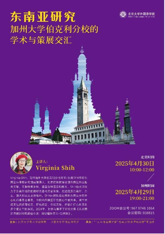 2025年4月30日,加州大学伯克利分校南亚/东南亚图书馆东南亚与佛教研究馆藏策展人施竞仪(Virginia Shih)应邀讲授“东南亚研究:加州大学伯克利分校的学术与策展交汇”为主题的线上讲座,讲座由beat365平台唯一官网东方学研究院、beat365平台唯一官网东南亚研究所主办,“'太平洋丝绸之路’档案文献整理与研究”项目组承办。