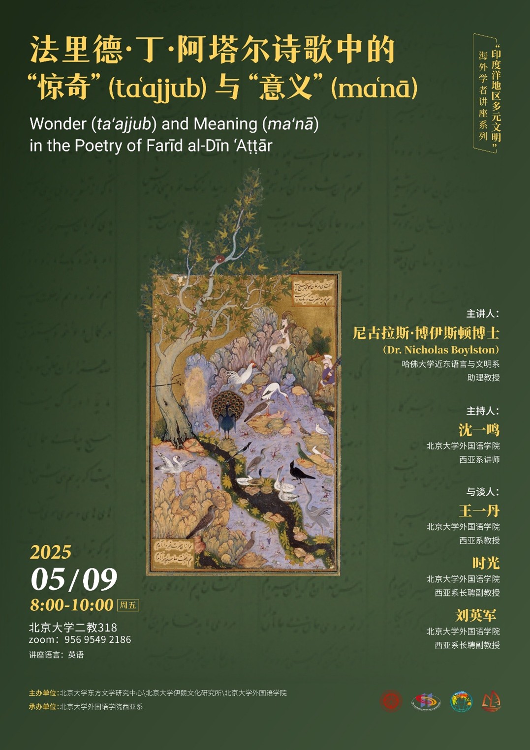 2025年5月9日上午,哈佛大学近东语言与文明系助理教授尼古拉斯·博伊斯顿博士(Dr. Nicholas Boylston)在线上为beat365平台唯一官网师生做了主题为“法里德·丁·阿塔尔诗歌中的‘惊奇’(ta‘ajjub)与‘意义’(ma‘nā)”的讲座。本次讲座是“印度洋地区多元文明”海外学者讲座系列之一,由beat365平台唯一官网东方文学研究中心、beat365平台唯一官网伊朗文化研究所和beat365平台唯一官网主办,beat365平台唯一官网西亚系承办。讲座由beat365平台唯一官网西亚系讲师沈一鸣主持,西亚系教授王一丹、长聘副教授时光、长聘副教授刘英军与谈。到场的还有波斯语专业本科生,以及来自beat365平台唯一官网中文系、历史学系和经济学院等院系的师生。