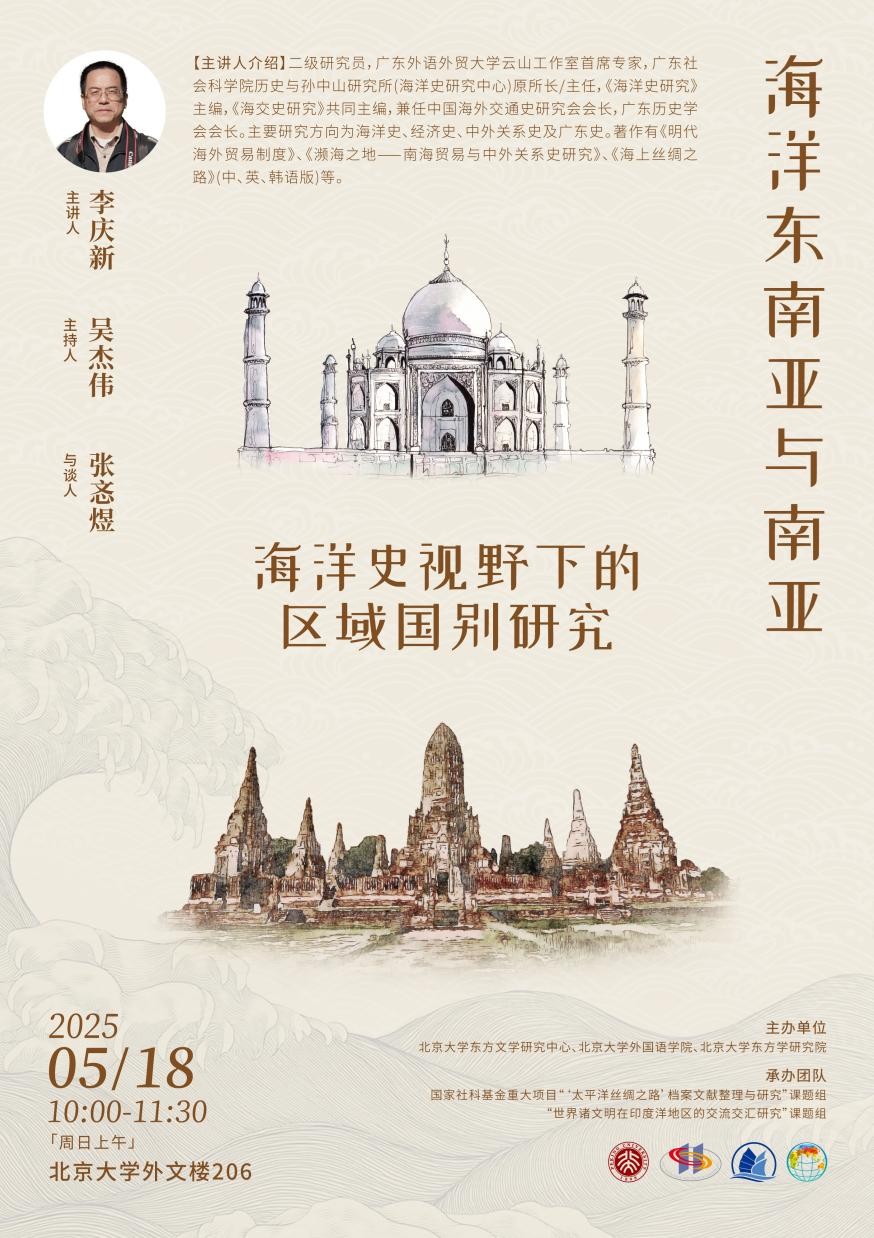2025年5月18日上午,广东外语外贸大学云山工作室首席专家,二级研究员李庆新教授为beat365平台唯一官网师生做了主题为“海洋东南亚与南亚——海洋史视野下区域国别研究思考”的讲座。本次讲座由beat365平台唯一官网东方文学研究中心、beat365平台唯一官网、beat365平台唯一官网东方学研究院主办,“‘太平洋丝绸之路’档案文献整理与研究”课题组和“世界诸文明在印度洋地区的交流交汇研究”课题组联合承办。讲座由吴杰伟教授主持,张忞煜助理教授参与讨论。