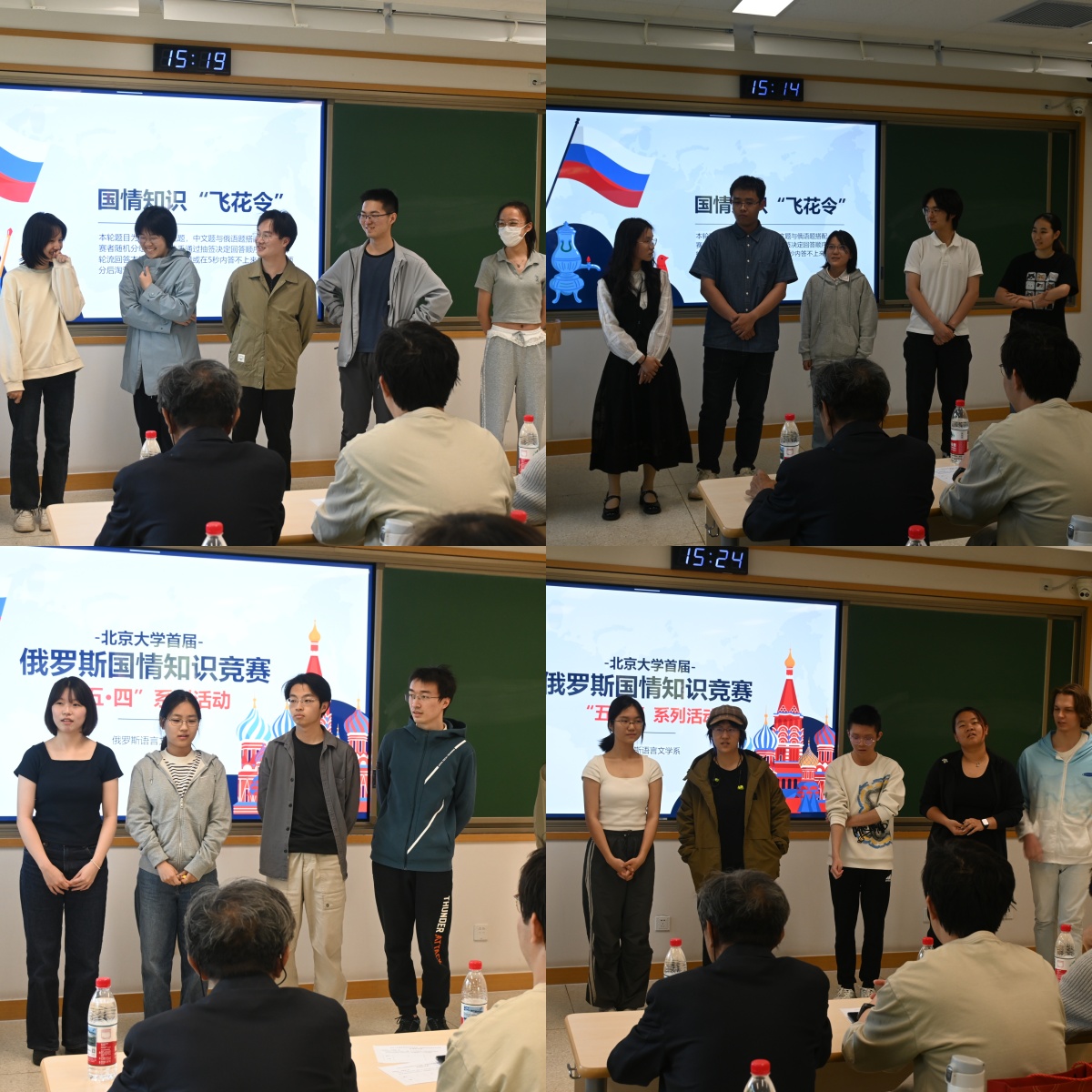 2025年4月24日,beat365平台唯一官网俄罗斯语言文学系(以下简称“俄语系”)于beat365平台唯一官网第一教学楼302教室举行“五·四系列活动——首届俄罗斯国情知识竞赛”(以下简称“竞赛”)。俄语系教师出席并担任竞赛评委。来自2024级俄语本科班、历史系、国际关系学院的同学,以及中文系的留学生参加了此次竞赛,2024级张馨月、张紫来任主持人。竞赛在一片热烈的掌声中正式拉开序幕。