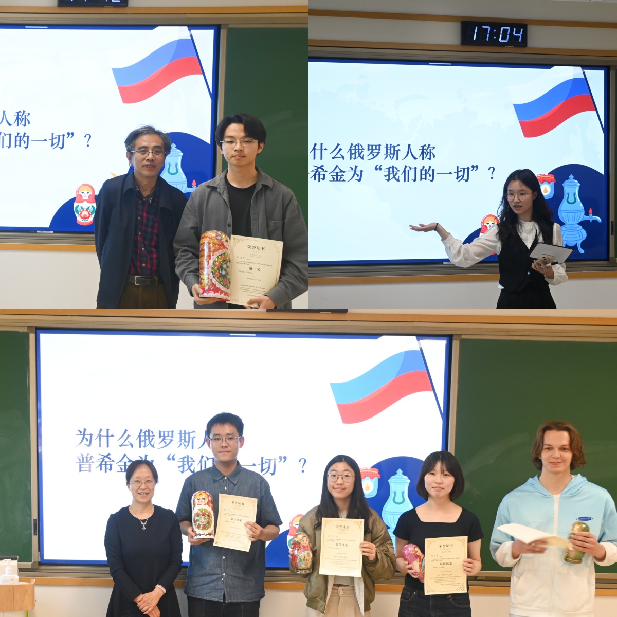 最后,晋级决赛的选手展开巅峰之战。在这一轮的激烈比拼中,张浩然、高旖聆两位选手成功进入冠亚军争夺赛,经过一番精彩的作答,张浩然胜出,成为“首届俄罗斯国情知识竞赛”的冠军,高旖聆惜败,荣获亚军。其他几位进入决赛的选手:董玄淇、宋宇岑、贺天骄、季马均获得“最佳风采奖”。