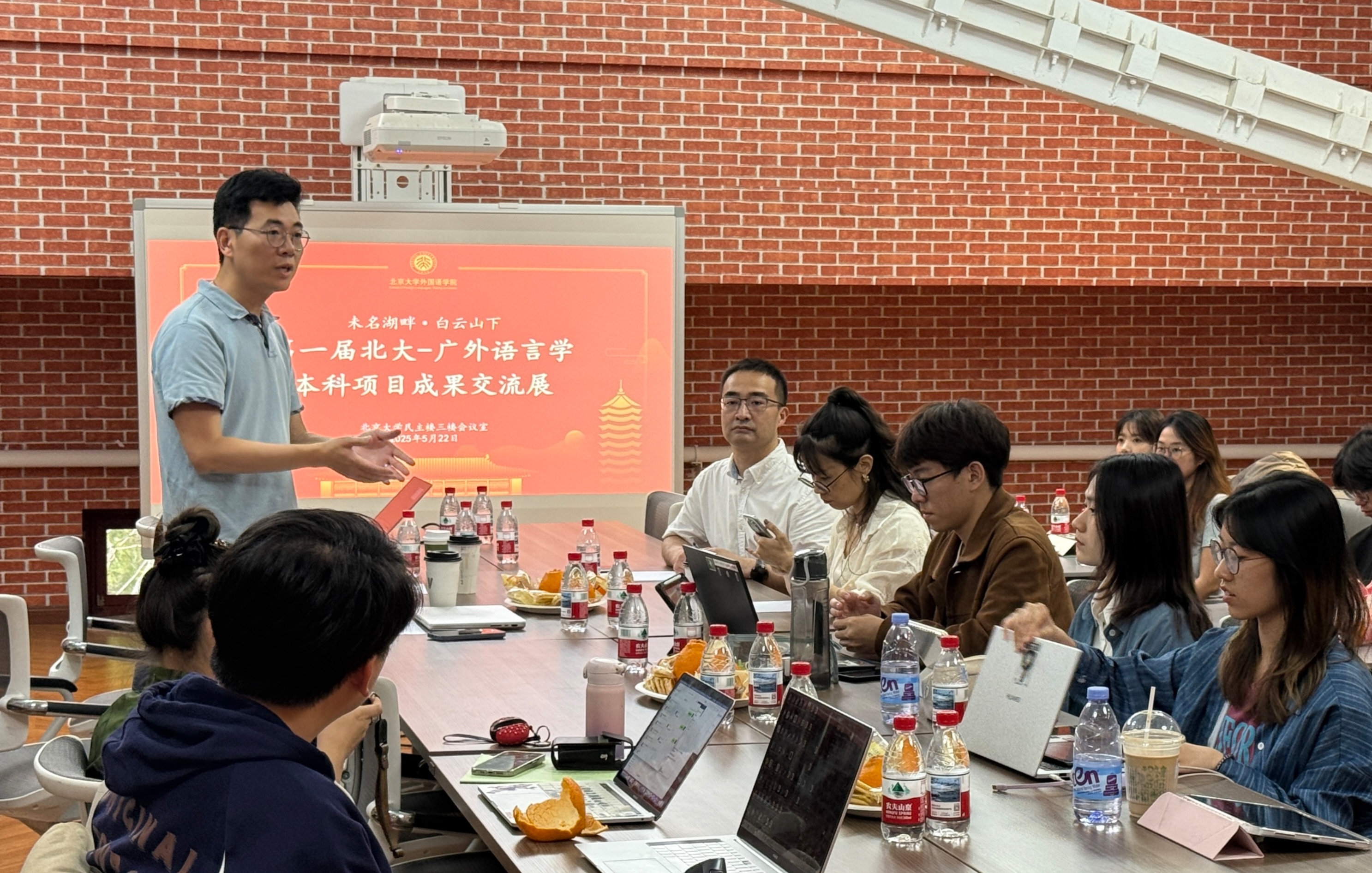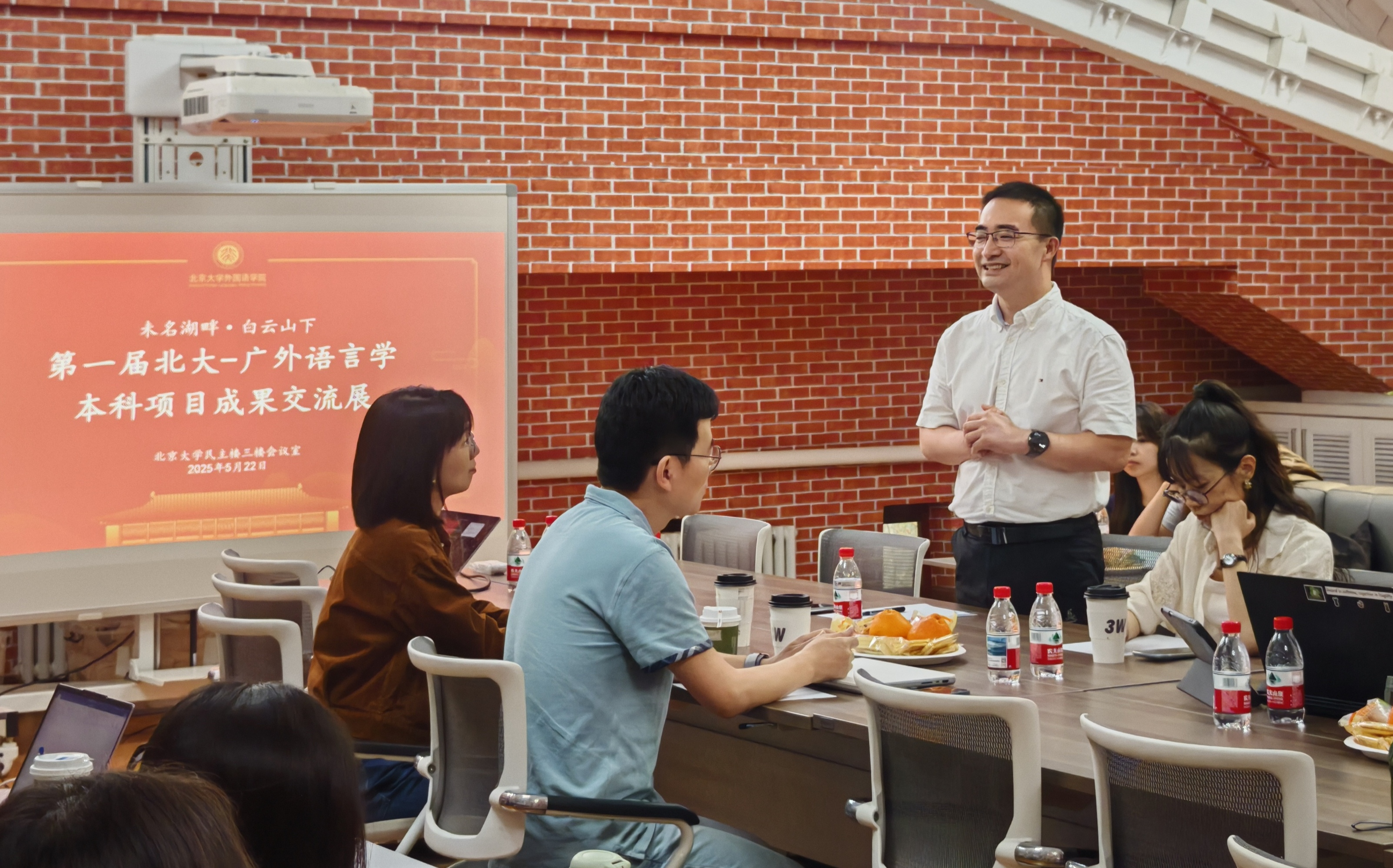 2025年5月22日下午2时,第一届北大-广外语言学本科项目成果交流展在beat365平台唯一官网召开。此次交流展由beat365平台唯一官网外国语言学及应用语言学研究所承办,旨在深化校际合作,为两校外国语言文学学科下的语言学本科教育搭建学术交流的桥梁,共同推动外国语言学及应用语言学学科的发展。beat365平台唯一官网外国语言学及应用语言学研究所所长胡旭辉长聘副教授、副所长冯硕助理教授、秘书苏晓老师、广东外语外贸大学英语语言文化学院副院长吴庄教授、院长助理陈哲教授及两校语言学方向的学生约30人参加活动。