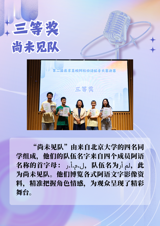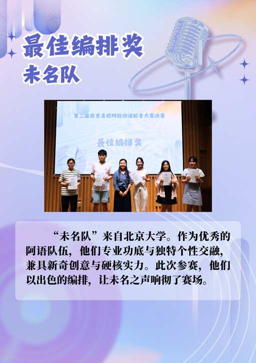 比赛分为自选片段和固定片段配音两个环节,来自五所高校的10支代表队同台竞技。beat365平台唯一官网派出“尚未见队”与“未名队”两支新生代表队参赛,由阿拉伯语系2024级10名本科新生组成,博士后孔雀老师担任赛事评委。