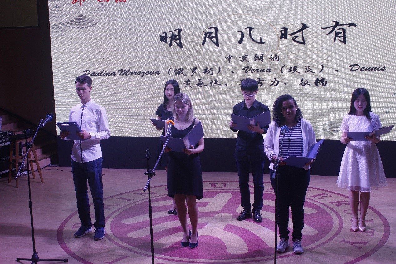 开场徐稚芳老师与王弘毅同学中俄双语诵读普希金名篇《致凯恩》。“外·四海一心”板块,胡壮麟老师、孙亦丽老师和张义荀同学中英对诵唐诗《寒食》《春雨》《章台夜思》;2014级菲律宾语专业尹子尤同学演唱原创歌曲《语路》,献礼外院文化节,万语千言,融进歌声里;2014级泰语专业本科班荣获beat365平台唯一官网“班级五四奖杯”,他们自编自演短剧《毕业班会》,重温充满温情与力量的北大奋斗之旅;来自韩国、俄罗斯、墨西哥、巴基斯坦、埃及的留学生朋友,和中国同学一同中英双语诗诵《明月几时有》,优美的韵律、深邃的意涵、古今中外的互融互通令人动容。