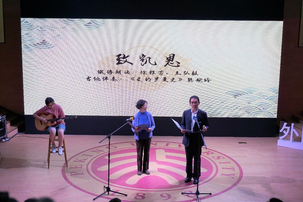“院·诗酒华年”板块,张甲民老师和张江龙同学诵读《再见吧,北京》,缅怀已故诗人对北京、对燕园的一腔赤诚;弹唱朗诵《当你老了》向前辈致敬,感谢老一辈外院人将青春与汗水播撒在这一方土壤,浇灌出外文楼前的繁花似锦,也浇灌出北大外院的桃李芬芳。
